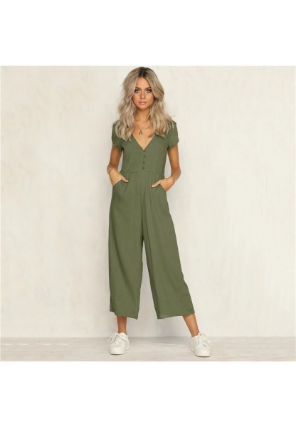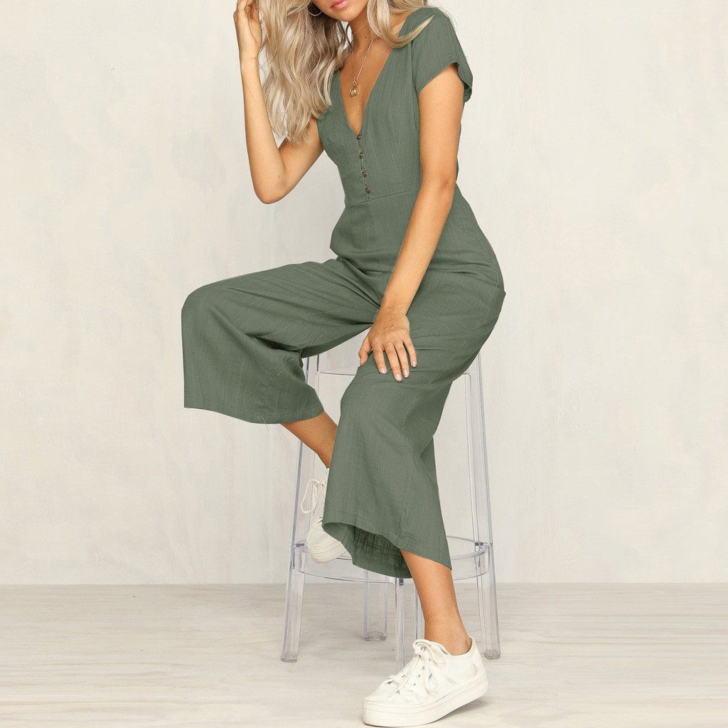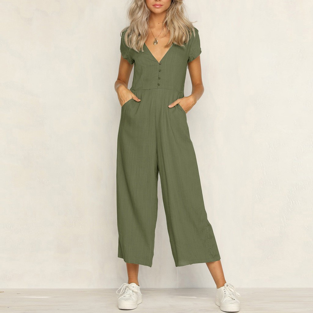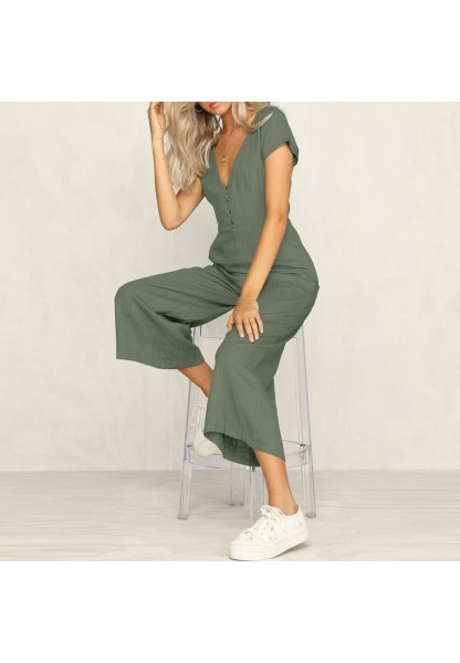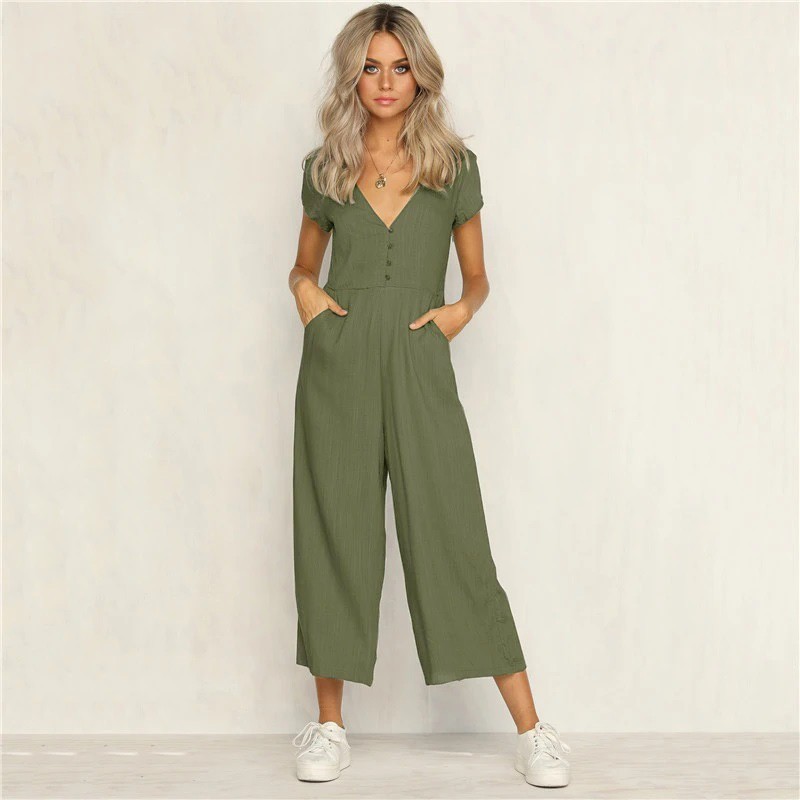 • Keten Günlük Yazlık V Yaka Kısa Paça Tasarım Kadın Tulum